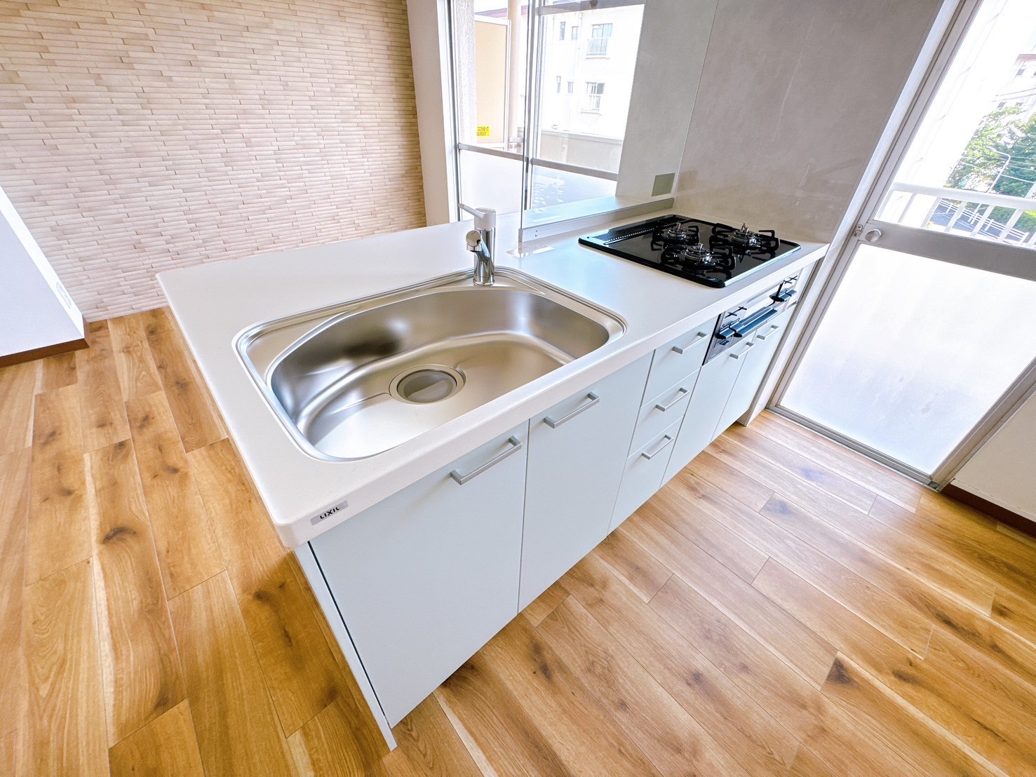 キッチンは白を基調としたコンパクトなタイプを採用しています。