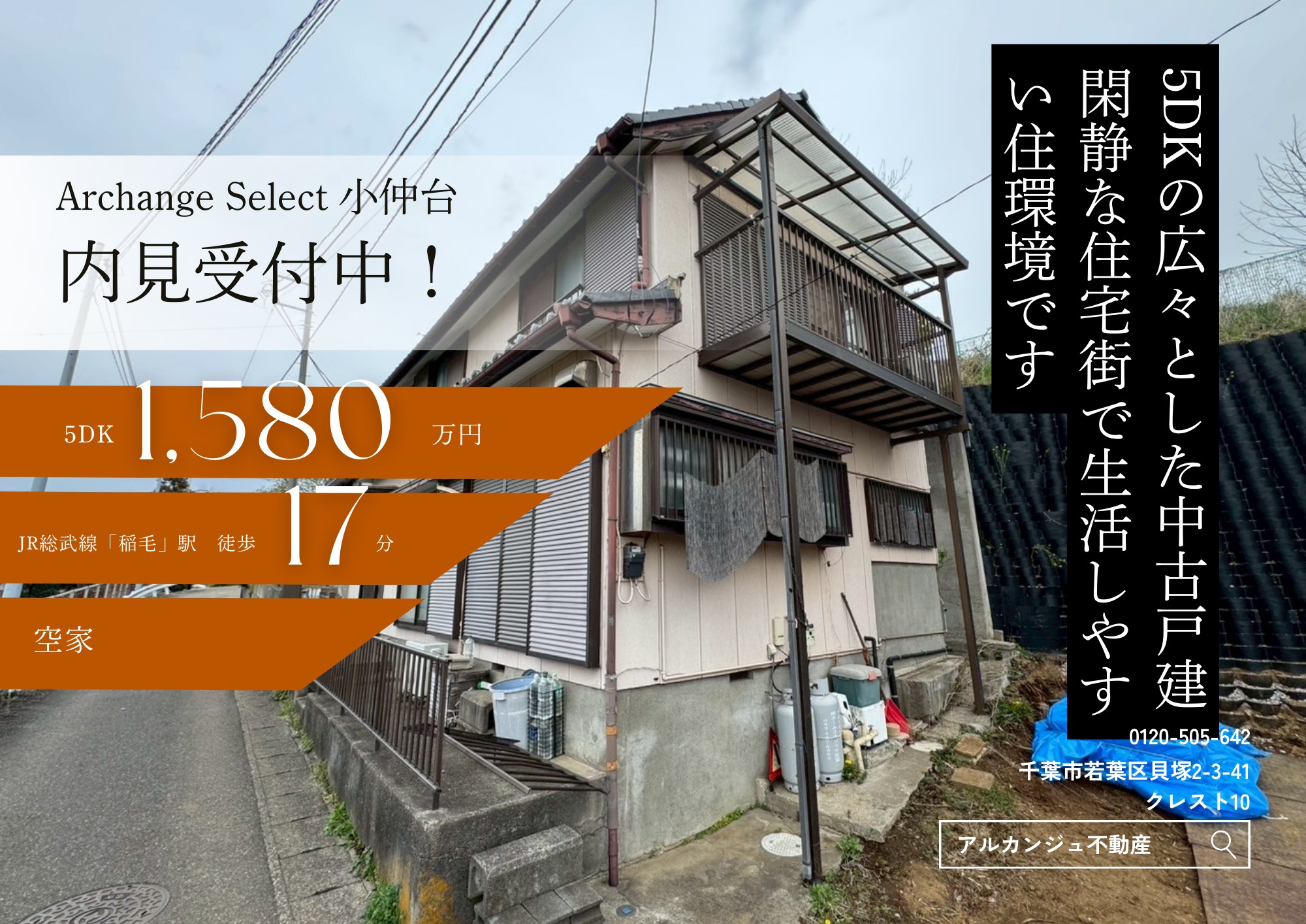 戸建てJR総武線「稲毛」駅 徒歩約17分Archange Select【小仲台】販売価格:1,580万円\JR総武線「稲毛」駅まで徒歩約17分の好立地!/ゆとりのある5DKの間取りの中古戸建です♪複数駅・路線利用可能なため移動もらくらく◎充実の周辺施設・閑静な住宅街により生活しやすい住環境です☆ -