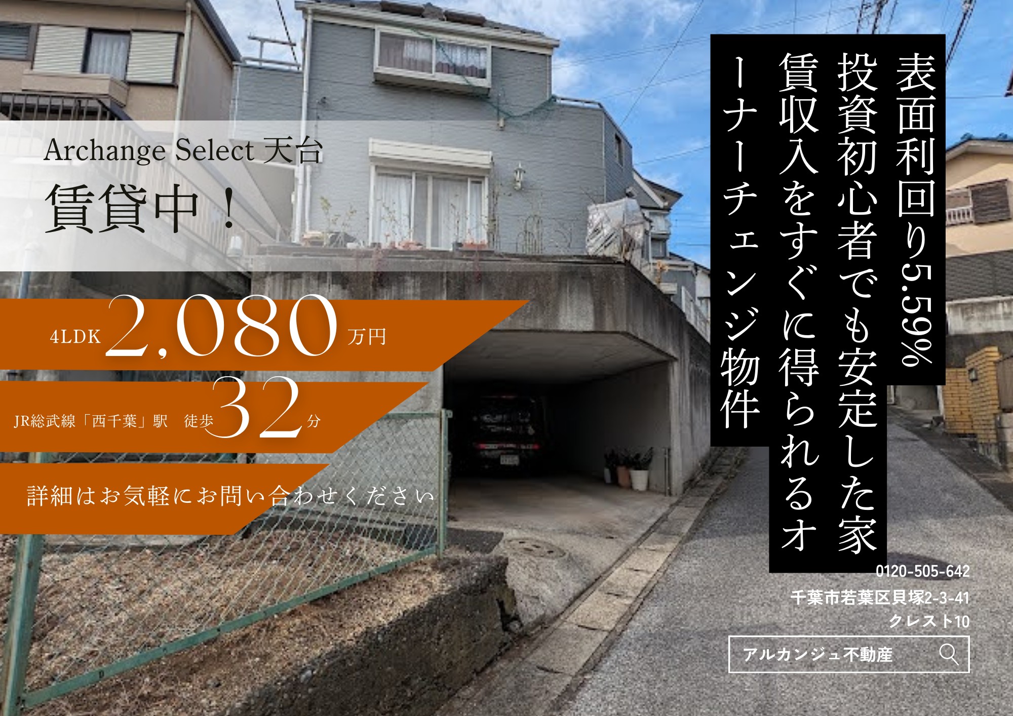 戸建て千葉都市モノレール「天台」駅 徒歩約10分Archange Select【天台】表面利回5.59%販売価格:2,080万円空室ゼロでスタートする確実な収入。入居者付きのため、投資初心者でも安定した家賃収入をすぐに得られるオーナーチェンジ物件です!手間のかかる入居者募集は不要。初心者にもおすすめの投資チャンスお見逃しなく。 -