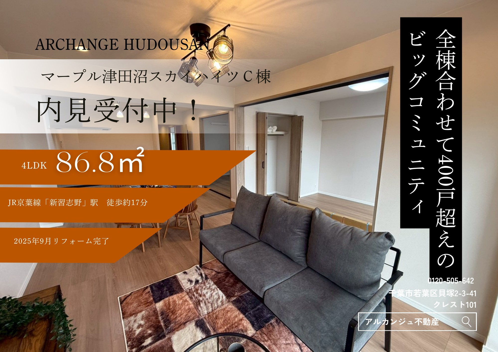 マンションJR総武線「幕張本郷」駅 徒歩約28分Archange Style【クレスト習志野】販売価格:1,850万円2026年1月内装リフォーム済み!アクセントクロスで一気にお洒落な内装に早変わり♪京成本線「京成大久保」駅徒歩5分の好立地☆周辺にはコンビニやスーパー、ドラックストア等全て揃っており、住環境良好です! -