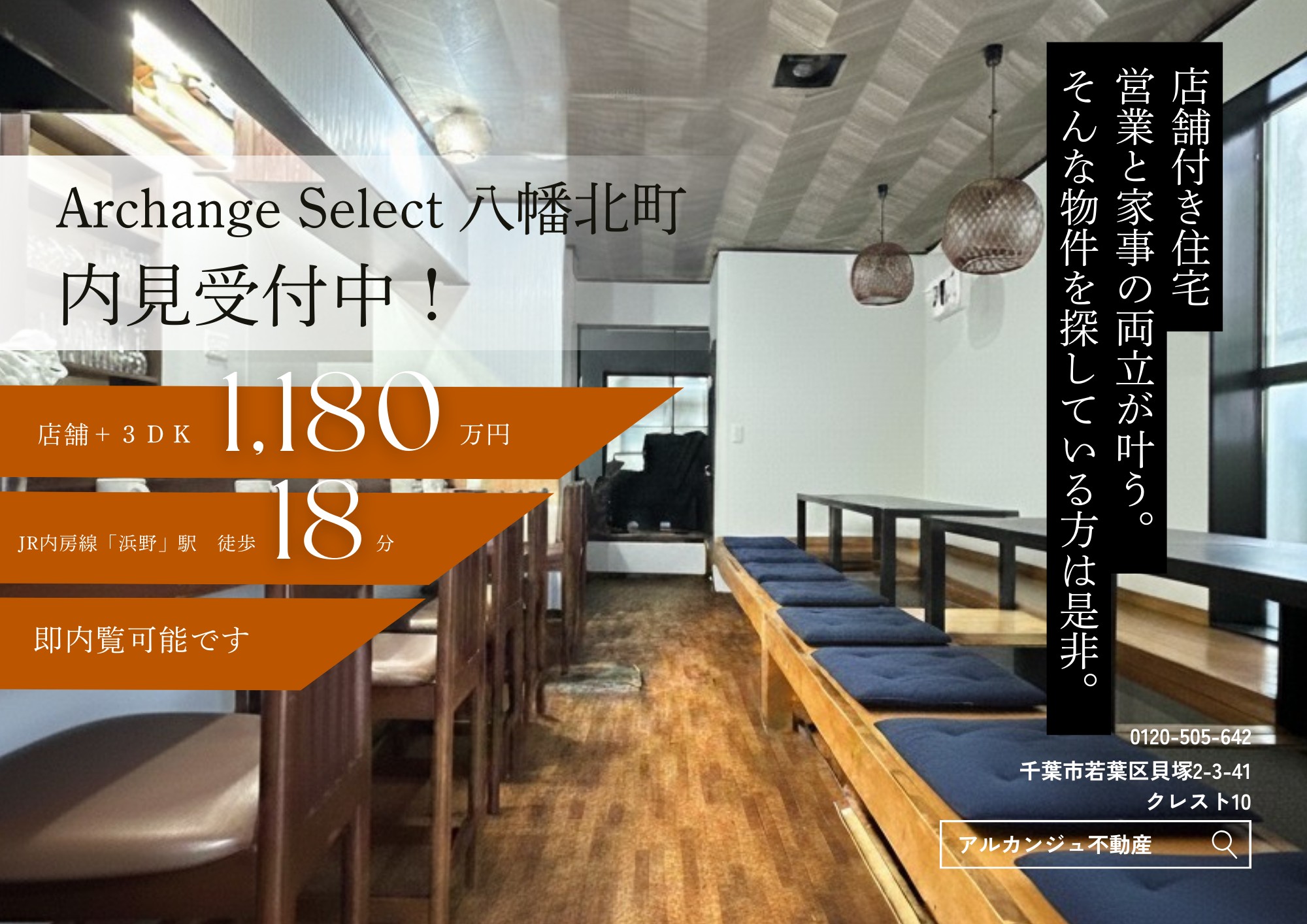 戸建てJR内房線「浜野」駅 徒歩約18分Archange Select【八幡北町】販売価格:1,180万円\店舗付き住宅/JR内房線「浜野」駅徒歩約18分!徒歩圏内にコンビニやスーパー、ドラックストア等がございますので、仕事終わりや急な買い出しにも気軽に行けて便利です。空室につき、即内覧可能です。 -