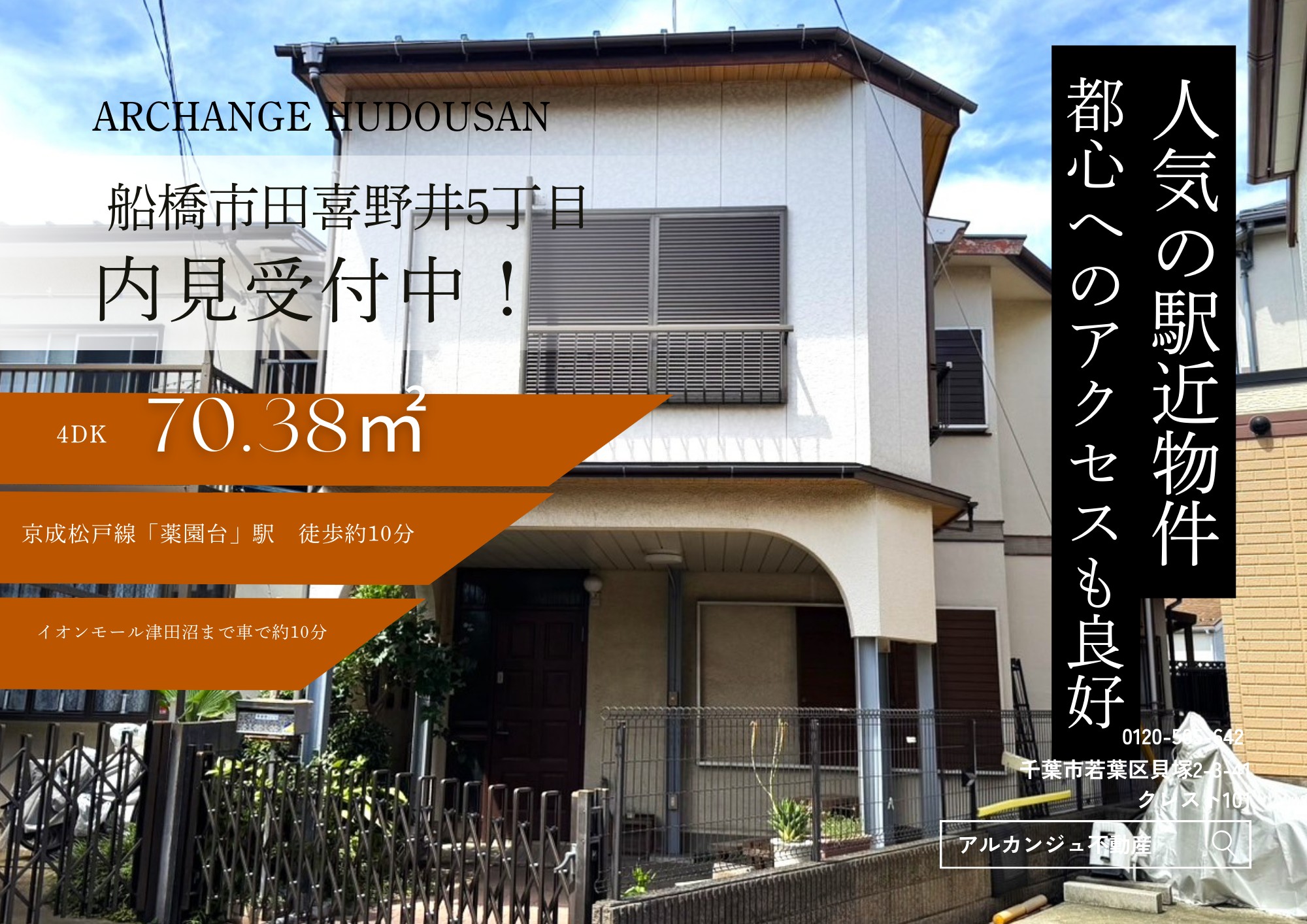 戸建て京成松戸線「薬園台」駅 徒歩約10分■船橋市田喜野井5丁目販売価格:1,280万円\イオンモール津田沼まで車で約10分/京成松戸線「薬園台」駅徒歩約10分!周辺にはお買い物施設も充実しており、駅も近いので都心へのアクセスも良好です☆和室付き!寛ぎのスペースとして最適です♪ -